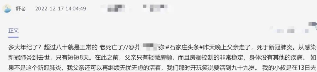 具体情况如下:作者@芥***弥 2022-12-17 06:12 发布微头条,讲述家中亲人去世的经历。内容发布后,引起了用户的关注和传播,被评论4977次、转发331次,后续作者自行删除了该内容。由于搜索结果呈现的技术问题,导致部分搜索结果用“...”代替了转发人的评论内容,造成用户误解。平台目前正高优推进解决相关问题,避免后续误解产生。