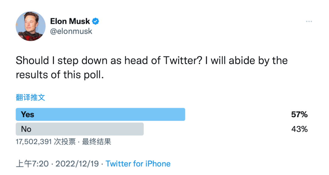 马斯克18日在推特上发起的投票:“我是否应卸任推特负责人?我将遵守这次投票的结果。”结果已出,超过1750万个帐号参与了投票,57%的人希望马斯克卸任。