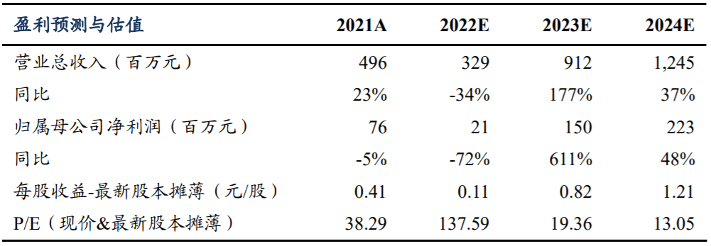 袁理预计2022-2024年公司归母净利润0.21/1.50/2.23亿元,同比变动-72%/611%/48%,对应PE为138/19/13倍。