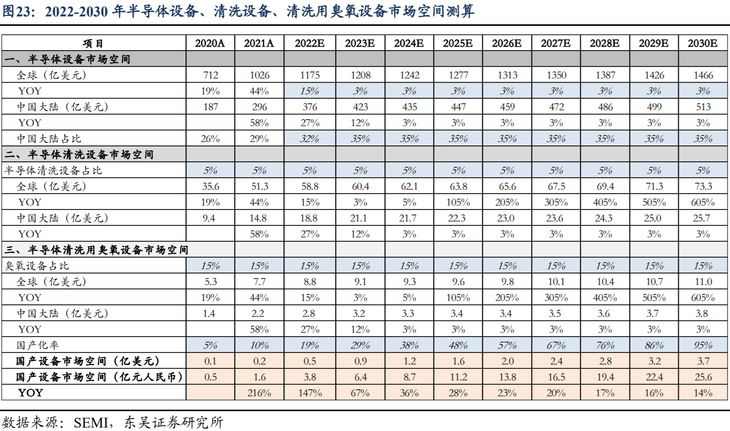 ①东吴证券袁理预计2025年/2030年中国大陆半导体用臭氧发生器本土替代空间1.6/3.7亿美元,较传统臭氧下游市场空间弹性超100%,2021-2030年本土替代空间CAGR达37%;
