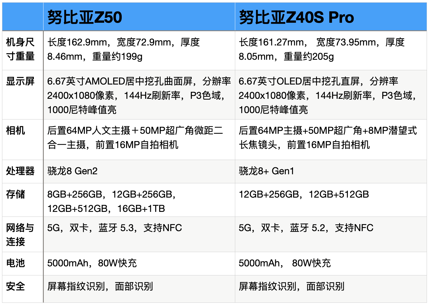 努比亚Z50与努比亚Z40SPro主要参数对比图: