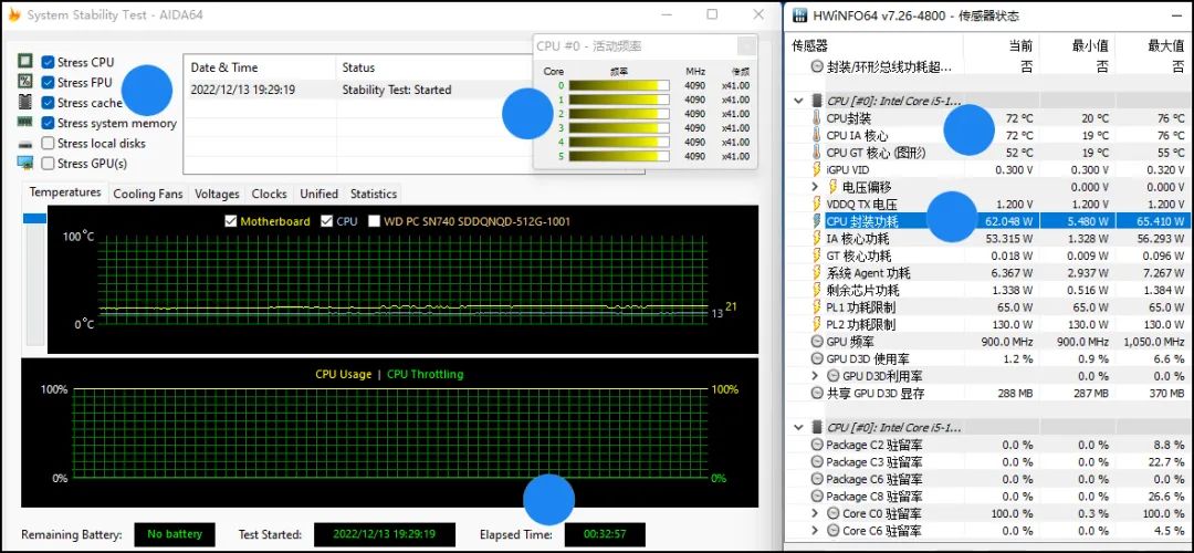 ▲英特尔款这边,i5 12500的输出功率最初是65W,然后缓降到62W左右保持稳定,全核频率4.1GHz左右,同时内部温度非常低,考了33分钟的机,处理器内部温度也就72℃——注意,两台电脑都相当安静,并不是“i5 12500款风扇转速高”才凉爽的。