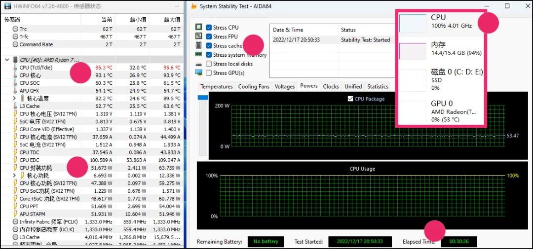 ▲AMD款的处理器是8核16线程的R7 5800H,7nm制程,高负载初期几秒爆发功率64W,但很快降到53W左右,并一直保持在52W~53W,全核频率4.01GHz左右。不过,这颗处理器的内部积热很快(这是AMD移动标压处理器的一个常见问题),温度迅速冲上了90℃,在室温仅13℃的环境下,拷机30分钟后,处理器内部温度有95.3℃。当然了,风扇转速并不高,所以该机依然安静,只是高负载下这样的温度让人有些小吃惊——毕竟是台式机。