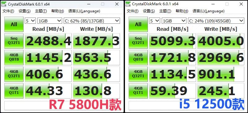 ▲先说个配置上的问题,两款启天的SSD规格大相径庭:R7 5800H款仅支持PCIe3.0规格的SSD,而i5 12500款却搭载的是PCIe4.0×4的疾速SSD(其实i5 12500处理器本身已支持到PCIe5.0了),速度快很多。另外,就即便是PCIe3.0 SSD,AMD款启天的速度也不算快,只是考虑到AMD款改过配,我们无法完全确认“本来的配置是什么”,所以这里暂且不下定论。