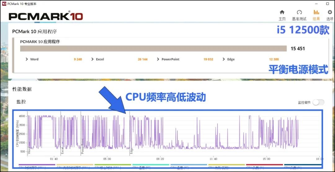 答案是:“CPU时钟频率、GPU核心时钟……CPU负载”等项目是作为测试过程中的动态监控存在的。举个例:比如i5 12500款启天,我们将电源模式改为“平衡”来跑PCMark10应用程序,得分会略微降低——但原因是什么呢?下面的监控曲线就侧面解释了原因。先看前面两组测试成绩图▲,在“高性能”电源模式下,CPU中的部分核心几乎都维持在最高睿频状态(4.4GHz、4.5GHz)来运行——不管有没有负载。而更改为“平衡”模式后,CPU的频率在测试过程中是不断爆发和降低的▼,在1GHz~4.5GHz这个巨大的范围内不停波动——有负载时瞬间爆发,没负载时马上降低,目的是为了“节能”。而这种波动的响应虽然极快(ms级),但依然会对性能造成些许影响——至少达不到最佳性能。总体而言,这个监控曲线对做深度分析有一定帮助。