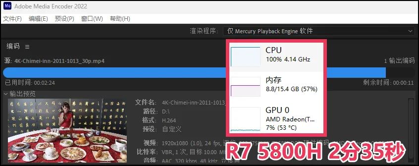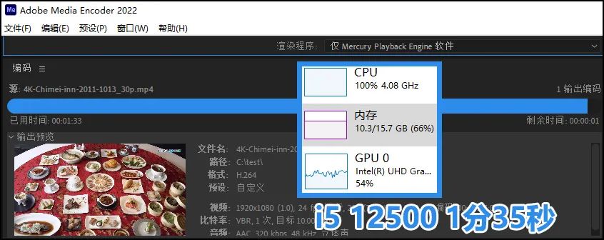 ▲而测试的耗时差距非常大,R7 5800H款耗时2分35秒,i5 12500款仅用时1分35秒,后者少耗时高达38%。而通过任务管理器我们的确可以观察到R7 5800H的集成GPU转码参与度的确很低,而i5 12500的集成GPU虽然性能不高,但转码参与度要高得多——这也是英特尔平台的视频转码环节一直保有优势的重要原因。