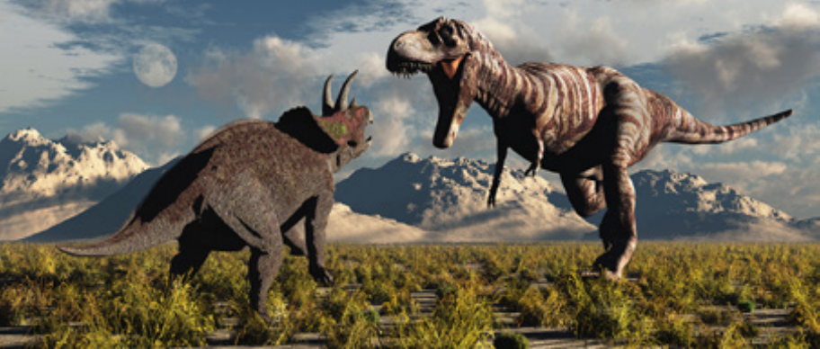 在霸王龙的统治之下,还有很多恐龙物种漫步在陆地上的每一个角落,它们同样是中生代不可或缺的成员:背挎长矛的棘龙挑战霸主的地位,长有头角的三角龙不甘沦为对手的食物,近十层楼高的梁龙伸长脖子傲视群雄,长有翅膀的翼龙正在训练着滑翔技术。