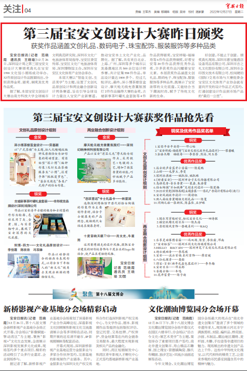 12月26日,深圳设计周之第三届宝安文创设计大赛颁奖典礼在宝安1990文化馆小剧场成功举办。32件原创设计作品脱颖而出,分别获得金奖、银奖、铜奖及优秀作品奖。