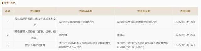 国家企业信用信息公示系统显示,12月26日,李子柒关联公司四川子柒文化传播有限公司发生工商变更,杭州微念品牌管理有限公司董事长刘同明卸任四川子柒文化公司高管职位,同时,股权由“李佳佳出资49万人民币;杭州微念科技有限公司出资51万人民币”变更为“李佳佳出资99万人民币;杭州微念品牌管理有限公司出资1万人民币”。