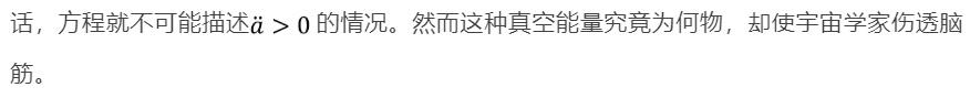 可是,当宇宙在加速膨胀被确认之后,现代宇宙学模型就不得不拾起Λ项这块补丁贴上,以此来代表使宇宙膨胀加速的真空能量。从弗里德曼第二方程就能清楚的看出,如果Λ≦0的