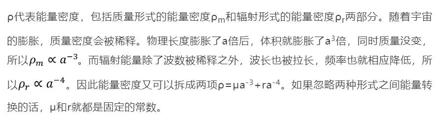 出于对自我中心主义的“鄙夷”,以及天文观测的事实,我们相信宇宙各处的各个方向都在均匀同步膨胀,只是在不同时间阶段的膨胀速度有所不同。于是a就与空间位置和方向都无关,仅是时间的函数a(t)。如果有读者听过那个“处处均匀且球形对称”的老梗,宇宙学中的标度因子绝对算是典型代表之一。