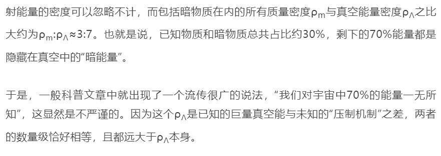 如果用百分比写出其比例的话,它会是一个小数点后几十位甚至上百位个0的微小数字。幸好有宇宙学和天文观测数据来拯救我们的茫然,否则我们会毫不犹豫地相信,真正统御宇宙的就是真空本身!