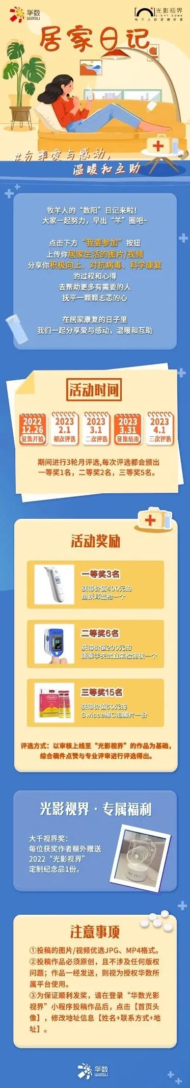 华数电视“居家医养”专区同步开通#居家日记#话题通道,您只需扫码登录“华数光影视界”小程序,就可随手上传您的居家生活图片或视频,与大家分享抗疫转阴经验与积极向上、科学康复的过程和心得,帮助更多有需要的人,打破心理恐慌,同心构筑强健心理防护墙。华数将为优秀的《居家日记》作者送出耳温枪、血氧仪、维C泡腾片等康复好礼,每位获奖作者,还将额外获得2022“光影视界”定制纪念品1份。