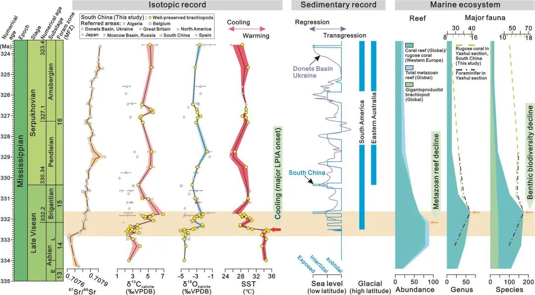 中国科学院南京地质古生物研究所晚古生代研究团队要乐副研究员等人,与美国内华达州立大学拉斯维加斯分校蒋干清教授,台湾师范大学米泓生教授,法国图卢兹第三大学Markus Aretz教授,南京大学王向东教授共同合作,利用腕足类壳体氧同位素、以及生物礁和多门类化石多样性统计,揭示了密西西比亚纪中-晚期气候变冷与珊瑚礁系统崩溃和生物多样性减少的关系。相关研究成果发表在地学领域国际知名期刊《全球和行星变化》(Global and Planetary Change)上。