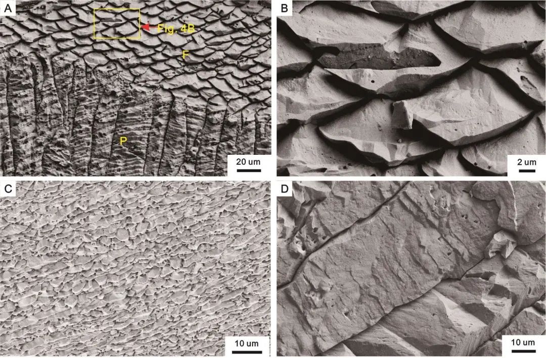 腕足类壳体扫描电镜下纤维状(A-C)和棱柱状(A, D)结构