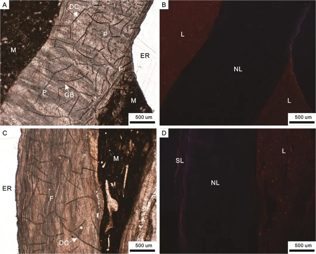 腕足类壳体单偏光(A, C)及其对应的阴极发光(B, D)图片