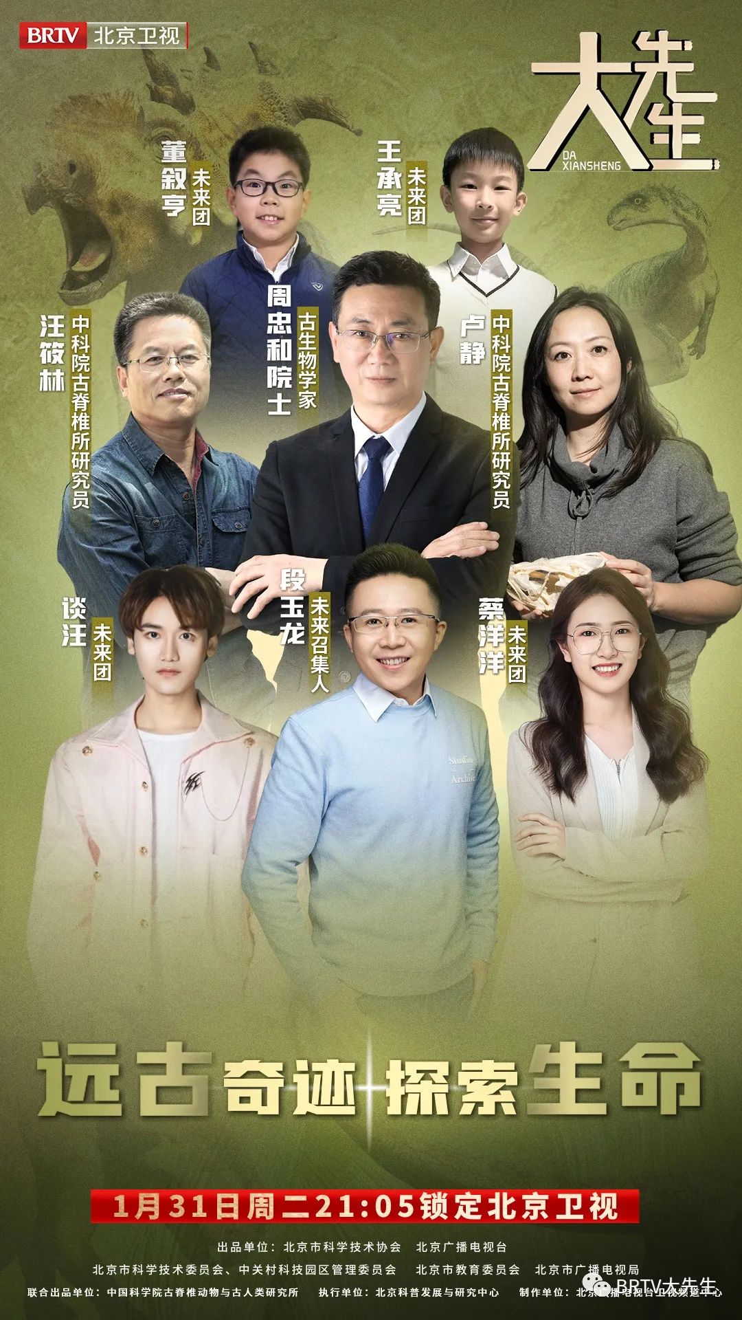 探索之心,历久弥新;求真之路,永不止步,由北京市科学技术协会,北京广播电视台,北京市科学技术委员会、中关村科技园区管理委员会,北京市教育委员会,北京市广播电视局联合出品的国内首档科学文化教育节目《大先生》于1月31日周二21:05在北京卫视播出。同时本期节目联合中国科学院古脊椎动物与古人类研究所,邀请中国科学院院士、古鸟类学家周忠和担任“大先生”,与带教老师汪筱林、卢静一起打破时空的壁垒,带领“未来团”成员走进中国科学院古脊椎动物与古人类研究所,挖掘距今数以百万年前“地球霸主”的真实面貌。