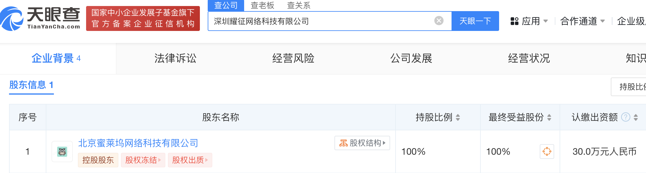 科技边角料获悉深圳耀征网络科技有限公司日前成立,注册资本30万元,法定代表人武凤颖,由映客旗下北京蜜莱坞网络科技有限公司全资持股。