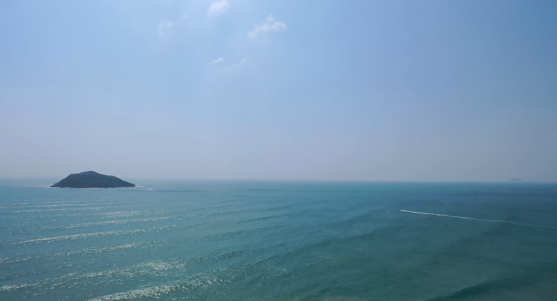 登上大花角的山峦又是另外一番味道,汹涌激烈在山峦被弱化,你好像在用上帝的视角看着一波又一波的海浪,但是它们渺小的像一条不断重复的白线。极目远眺,烟波浩渺的南海水天一色,浑然一体。