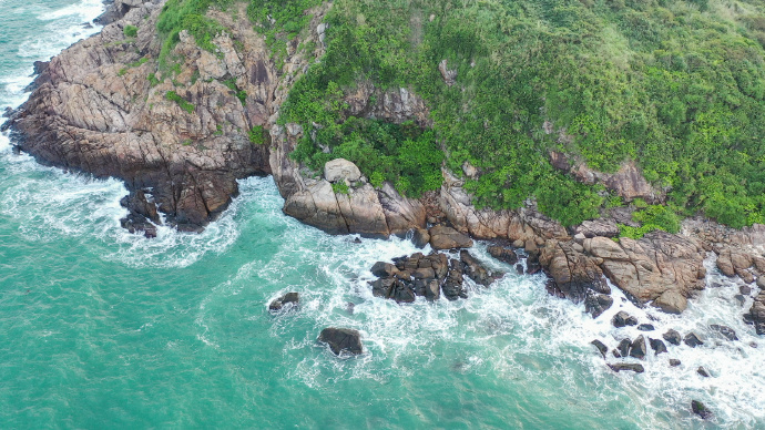 一面树林繁茂,轮廓崎岖,礁石非常多且嶙峋,浪花簇拥,不断拍打着岛屿,异常壮观。