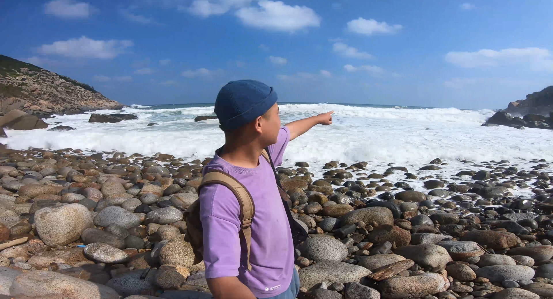 大花角由前鞍和后鞍两个山峦构成,双峰之间有一处宽近百米的峡谷,与双峰一起伸向浩瀚的南海,于是形成一个天然的海湾。还没下车海浪和海风自由的声音突然灌入耳中,让我瞬间感觉到它的快乐、自由。卵石有些扎脚,但却在提醒我这一切的真实。