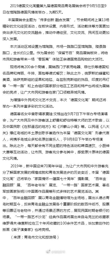 【在青岛领略异域风情!德国文化周今日开幕,文化盛宴等你来!】一年一度的德国文化周即将开始啦!9月5日-9日,欢迎广大市民游客朋友来馆陶路德国风情街,这里有让你心动的好货,有难得一见的艺术展览,有不同主题的精彩节目……来吧~在青岛就可感受原汁原味的德国风情~