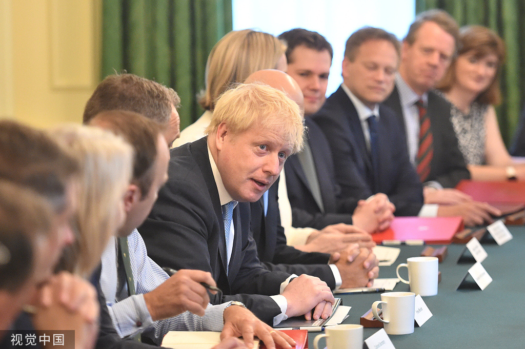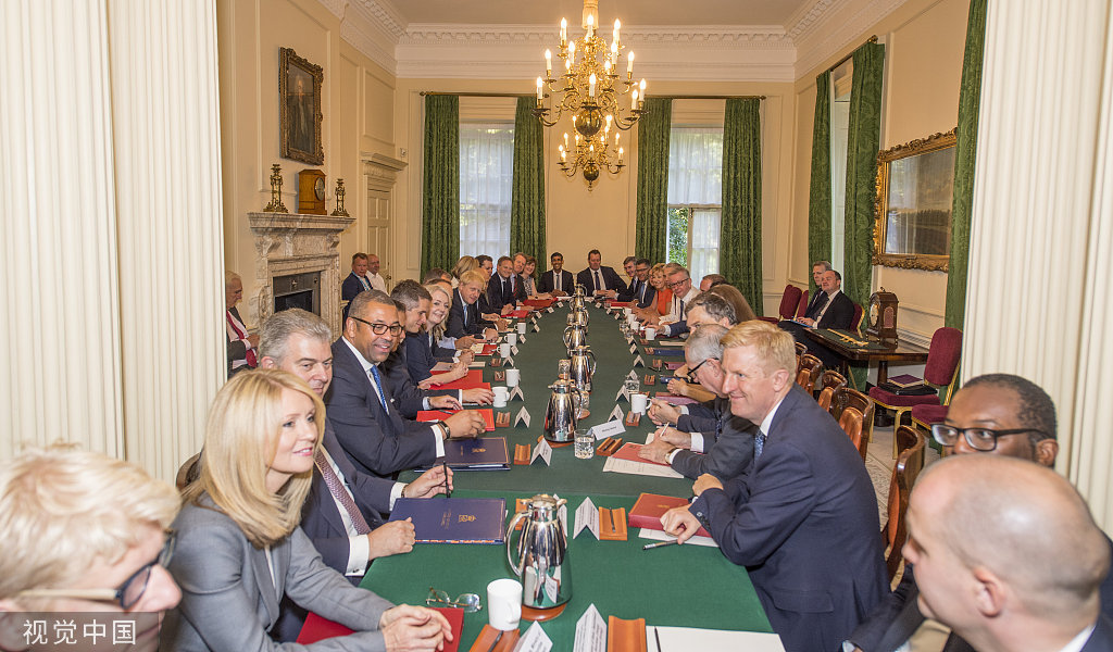 当地时间2019年7月25日,英国伦敦,英国新任首相鲍里斯·约翰逊召开首次内阁会议,新任命内阁成员参加。新任英国首相鲍里斯·约翰逊24日入主唐宁街10号首相府,当日即对政府内阁成员进行大换班,取而代之的新内阁成员以“强硬脱欧派”为主。