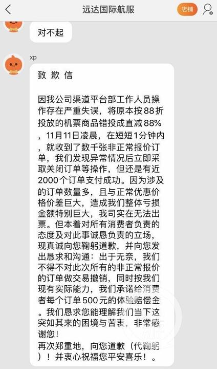 远达国际航服通过其官方飞猪账号发布了一封致歉信,信中对于当天出现错误价格的原因进行了解释,称“因为公司渠道平台部工作人员操作存在严重失误,将原本按88折投放的机票产品错投成直减88%”,双十一当天凌晨1分钟内就收到了数千张“非正常”报价订单,有近2000个订单支付成功,“造成整体亏损金额特别巨大”。远达国际的客服也在相关声明中恳求购买了机票的消费者理解“突如其来的困境与苦衷”,并进行了道歉。