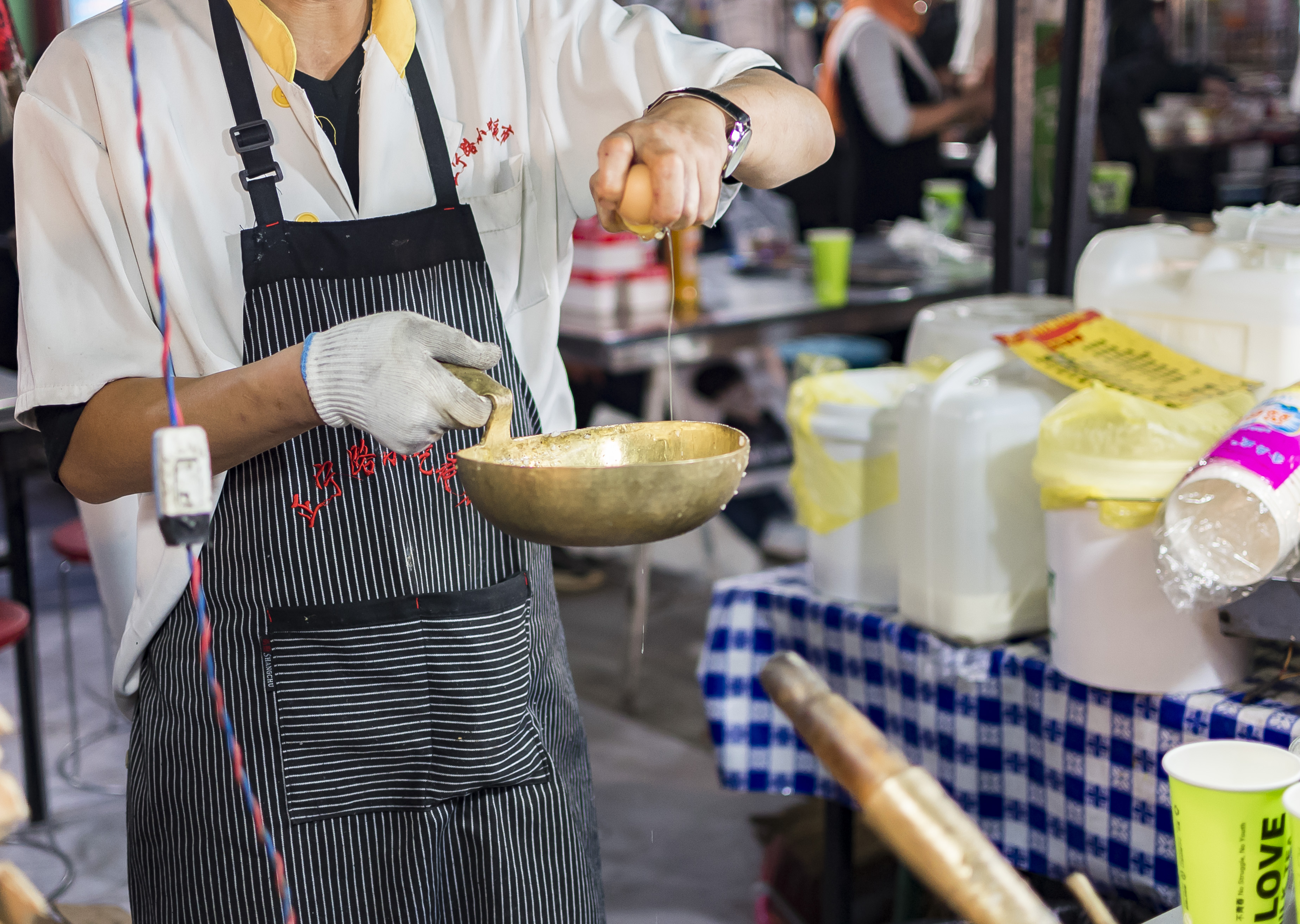 这张照片拍摄的是打鸡蛋的过程,有天赋的可以在街上学习一下,说不定回家自己也做得很好吃哟~