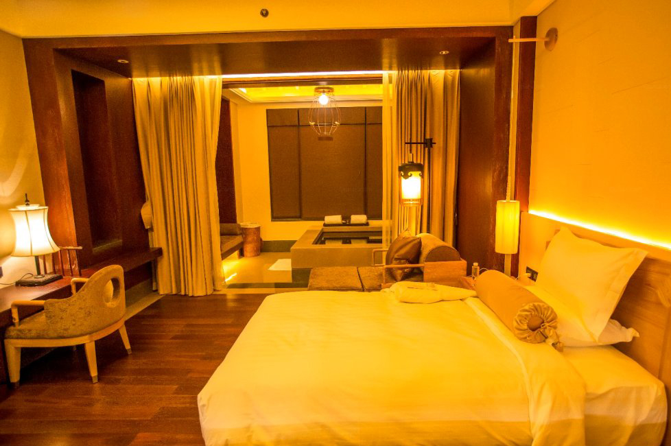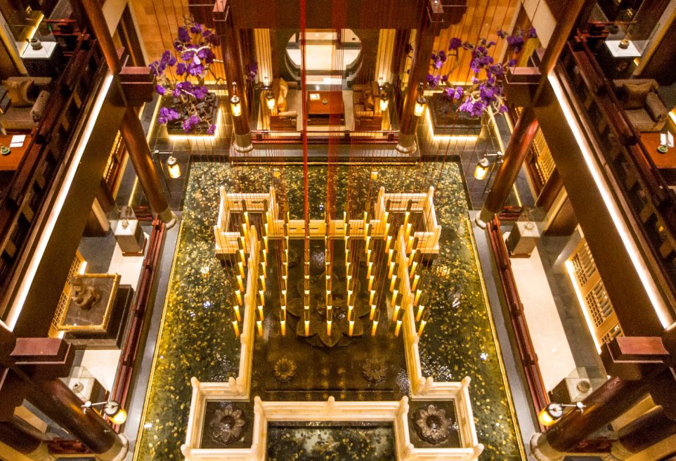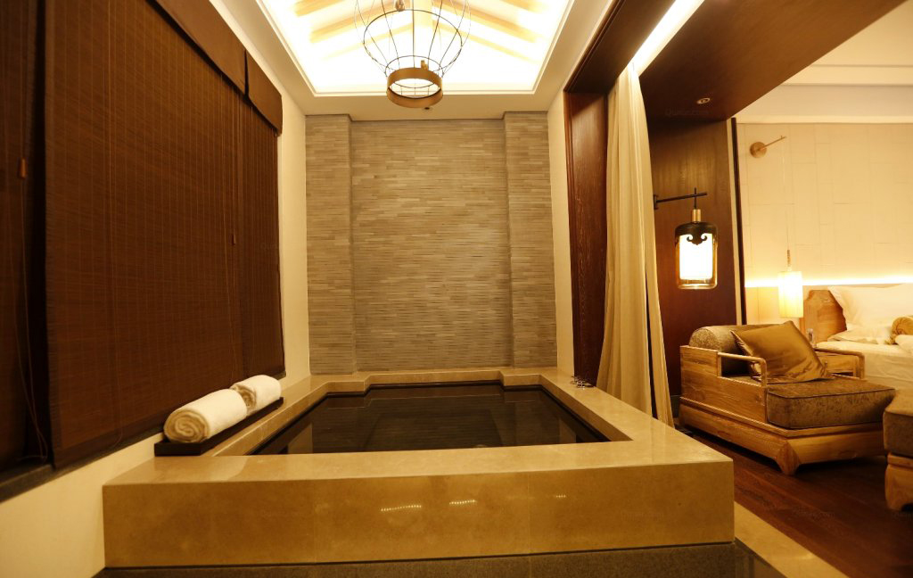 来到三楼俯瞰中庭,更是有气势蓬勃,古韵流芳,光影摩挲,高雅大气,暗暗赞赏设计师的天才! 入住的尊享汤房,室内部分的设计和建筑设计融为一体,从门,家具设计用材皆为实木订制,并延续莲花的主题。灯具的细节纹饰,靠垫的刺绣图案,处处体现盛唐的古风古韵。