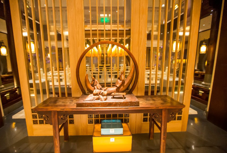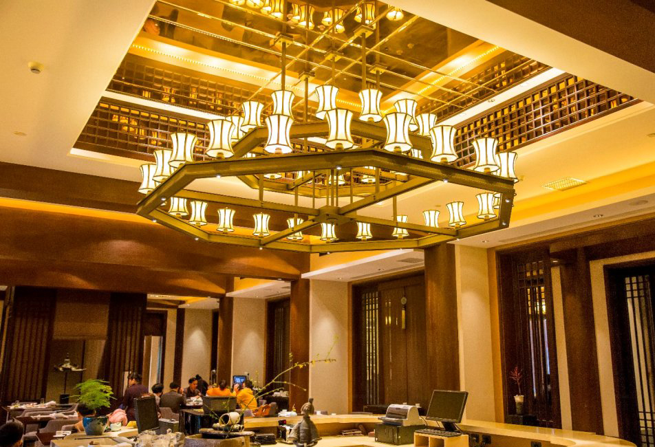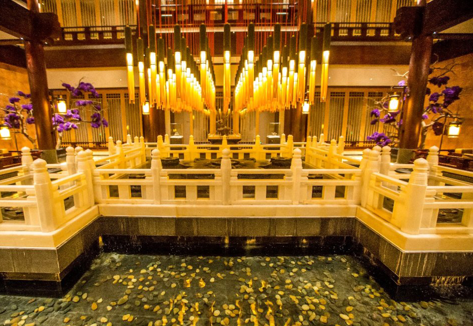令人惊艳的是大厅内堂的设计,隔着白玉栏杆,一圈光影灯光设计,正中为不断出水的莲花一朵,水流很轻脆,据说是静心池。上悬九十九根灯柱,是宫廷中吉祥如意的象征。