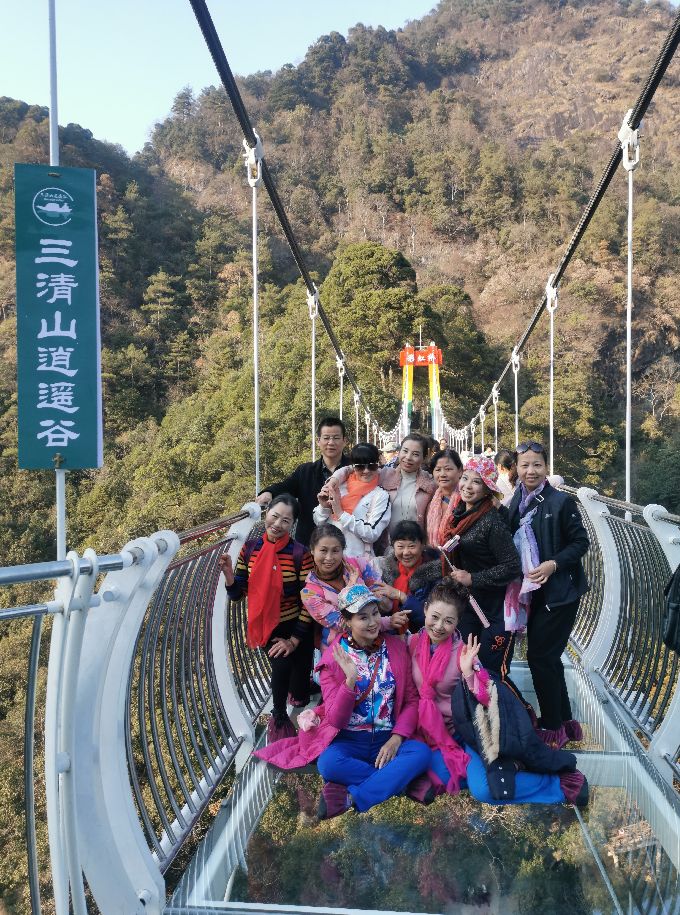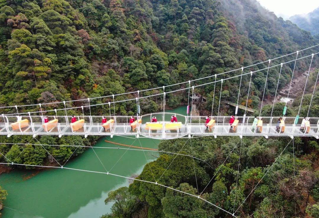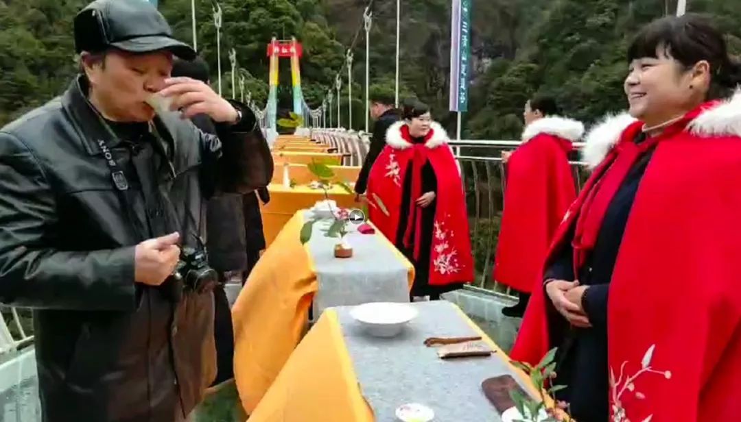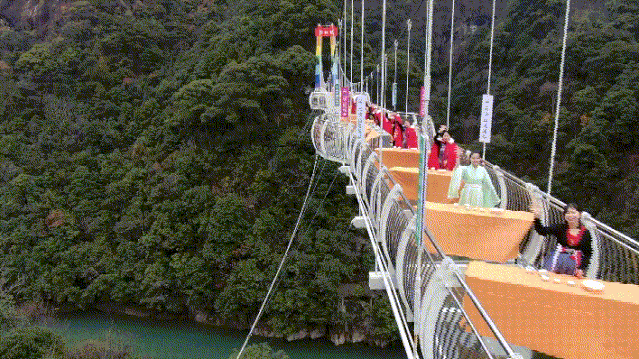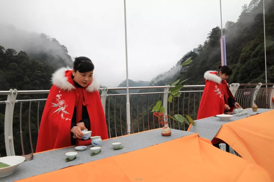 今日上午,20位茶艺师在云山雾绕的三清山逍遥谷国内首座双彩虹景观玻璃桥上举行“三清红”空中茶艺表演,融合中国传统茶艺文化与网红产品,迎接2020新年到来,为来三清山逍遥谷游客迎春接福。