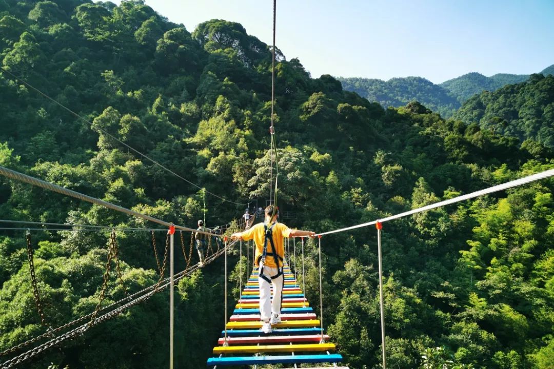 白虎挑战桥,挑战桥长118米,距谷底50米,分铁索和三彩铺板并列两道。参与白虎挑战桥体验,对体力和毅力都极具挑战。跨过山谷,飞越丛林,步步惊心!