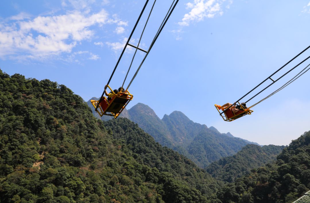 悬崖秋千一共3组,最长摇幅29米,安置于聚仙台悬崖上。四周是绵绵群山,脚下是百米深谷,是激情与浪漫相融、尖叫与心跳交织的绝妙体验项目。让你冲上云霄,尖叫响彻山谷,真正年轻快活一回!