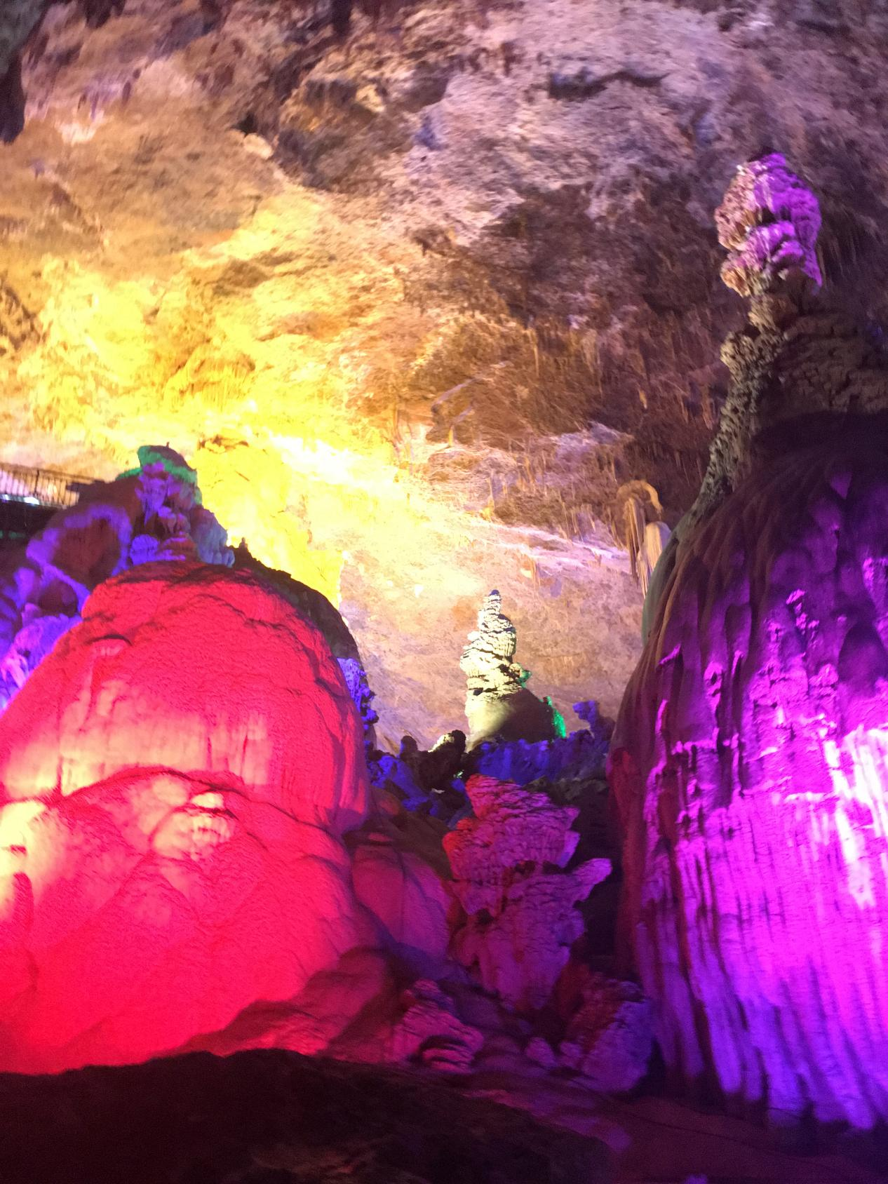 洞内,钟乳、石笋、石柱、石幔、石帘、石花、石屏,在霓虹灯的照射下和烘托下,或玲珑剔透,或瀑泻泉流,或巍峨雄奇,或珠落玉盘,绚丽多彩,千姿百态。栩栩如生,巧夺天工。