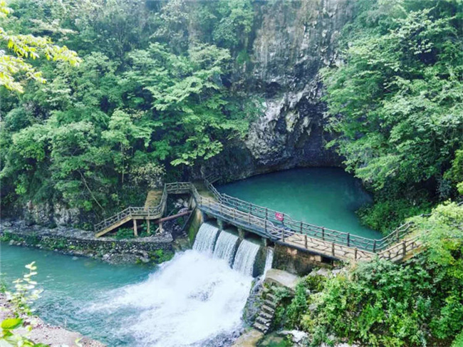 龙隐谷因为是喀斯特地质地貌,地表上并不积雨、积水,那一湾碧绿、清澈、纯净、甘甜的河水,涌于太清洞斜对面的一个小小的岩洞。