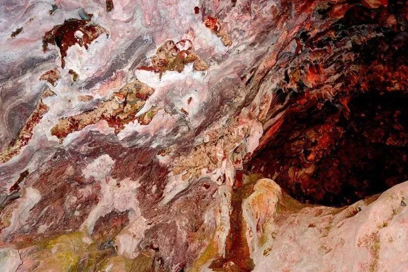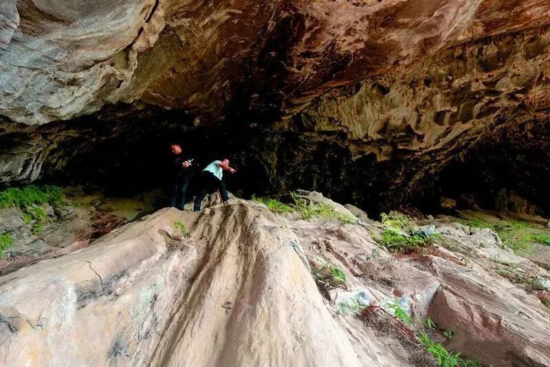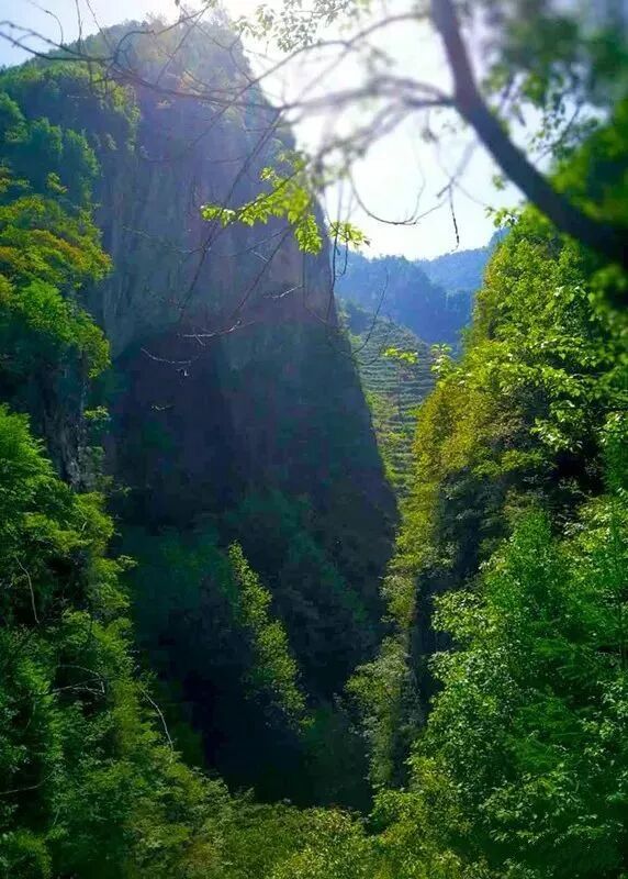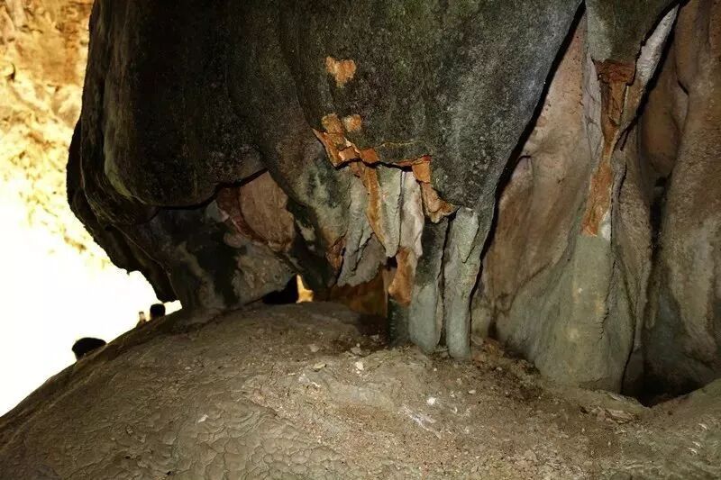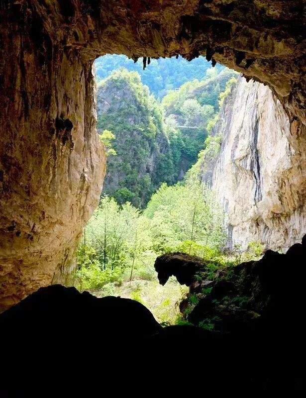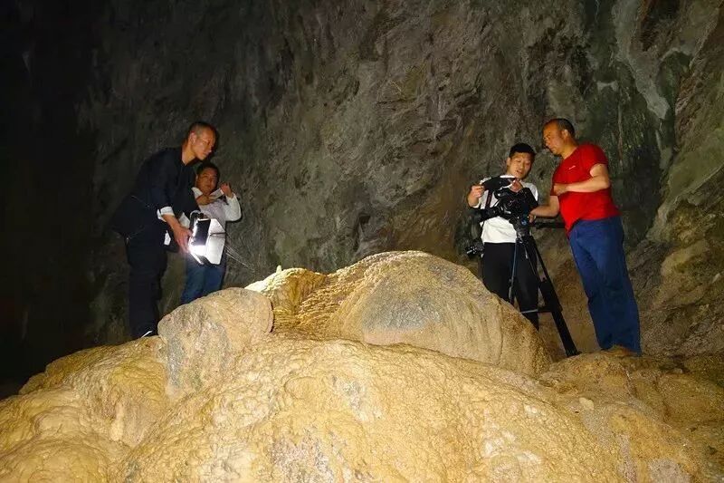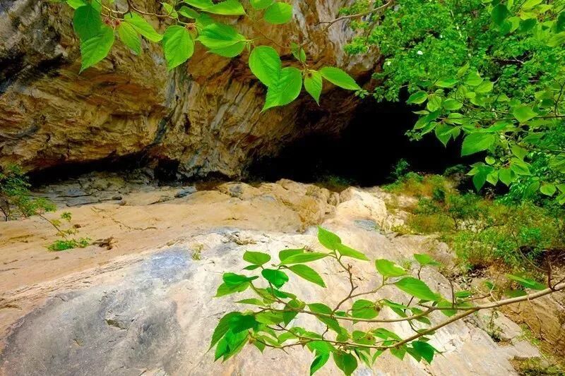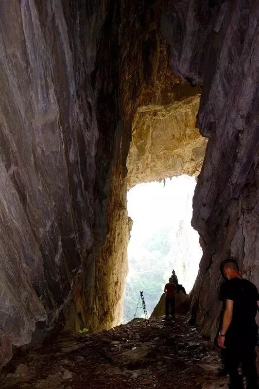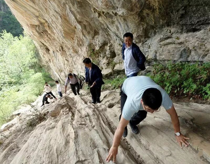玉皇洞因村对面有玉皇庙而得名。从瀑布底角看,洞顶直抵仓幕,高三四百米,影影绰绰的一排树木分开了天与地的界限。弃溪上行,爬过坡地树林,到瀑布上端,见洞底,皆页岩,片凹相间,四十五度坡,直至洞顶。向上爬行,绝不可直至,需匍匐在岩石上,脚手并用,方才一步步缓行。好在岩石干燥,又有可供踩脚抓手的断层,看起来危险,爬起来还算安全。至洞顶,向外看,如在天上看人间,洞顶的几粒水珠在阳光中晶莹下落,洞外的小尖山如蓬莱仙岛,头顶的石柱石幔似仙界的灵宫,找块可以依坐的岩台,忘记了这也是尘间。洞东北侧有一小洞,底部潮湿,纵深七八米,贴着石壁能听见水流的声音。同行的当地人说,山背面亦有洞,很小,扔进石头,能听见落入水中的声响,这个洞与背面的洞应该是相通的,所以雨天,这个洞中会有水流出。