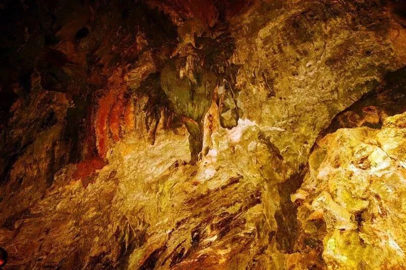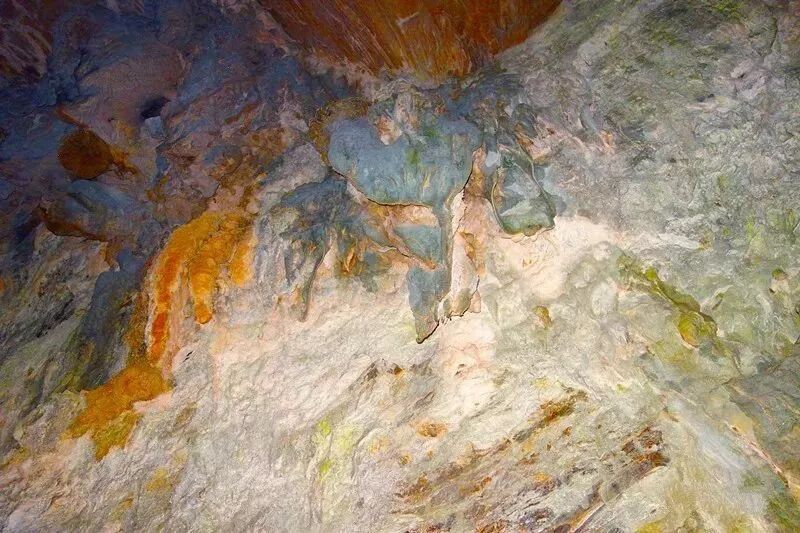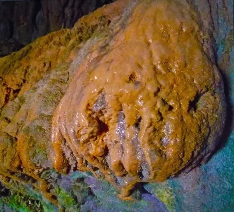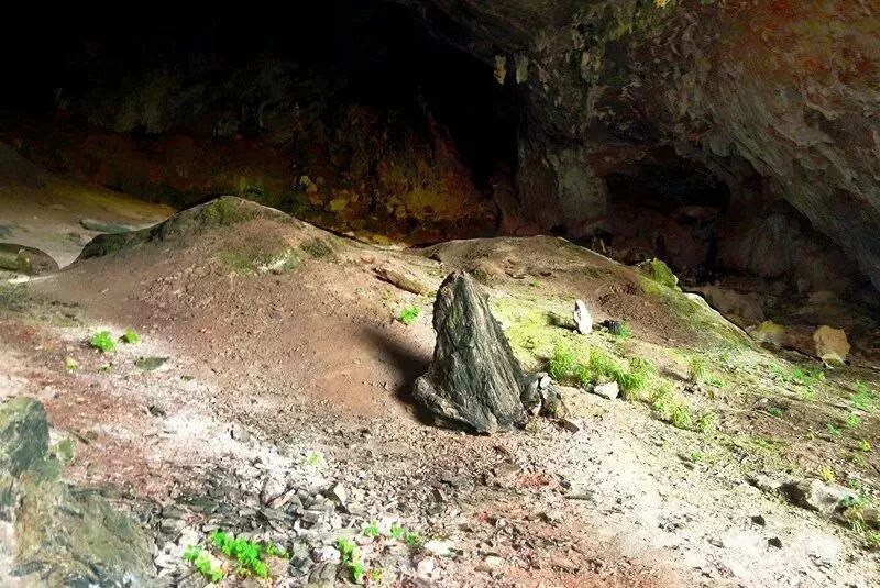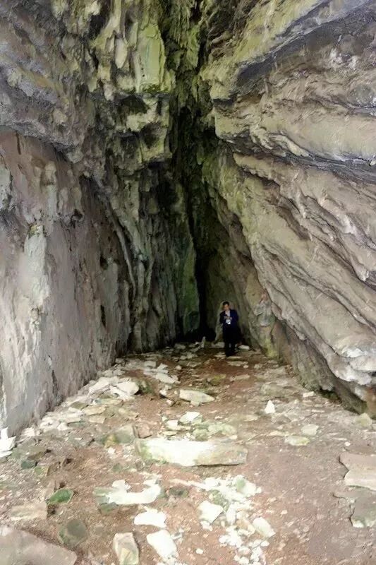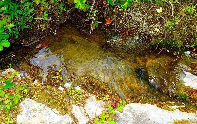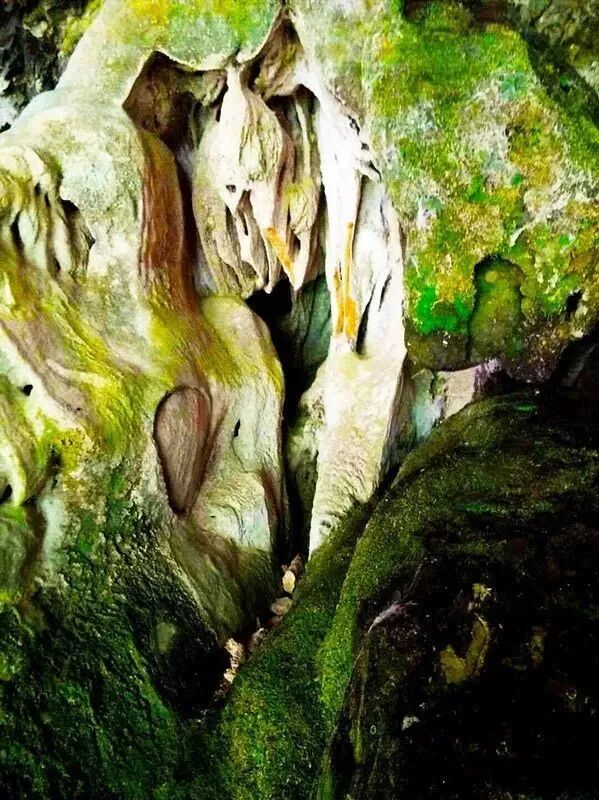 老庄西北逾1000米,折行,穿丛林,过荒田,见一斜坡,皆岩石,树木藤条弥生。斩薪伐路,抵悬崖脚底,豁然一洞,洞口高四五十米、宽十来米、深二十余米,形同隧道。洞内五米左右居中有一坠石,如下蹲之青蛙,仰头向洞内眺望。洞口至青蛙一带,平如砥砺,土壤酥松,稀疏有序地生长着同一类野草,茎嫩叶肥,并不知道其名。青蛙向内,中间土茆,好似渐次皱起的荒原。东边似沙滩,皆乳化石;西边叠置着几块巨石,纵然是天然的,又好似人为放置的。洞两臂页岩有序,东似万佛窟,西似断崖壁。顶上石柱石幔杂悬,形态各异,争分向下伸张。至洞末,见一钟乳石平台,平台顶部似梨形睡莲,莲花之上,有水珠滴落,在莲花与崖壁之间的葫芦凹里聚一水池,一平米左右,水深十来公分,不溢不旱,清澈透底。石壁上伫立三大石人、石马。最大的石人不知何时断裂,横倒在莲花东侧。先前,人们祁雨,都要到莲花池取水,是名神水洞。