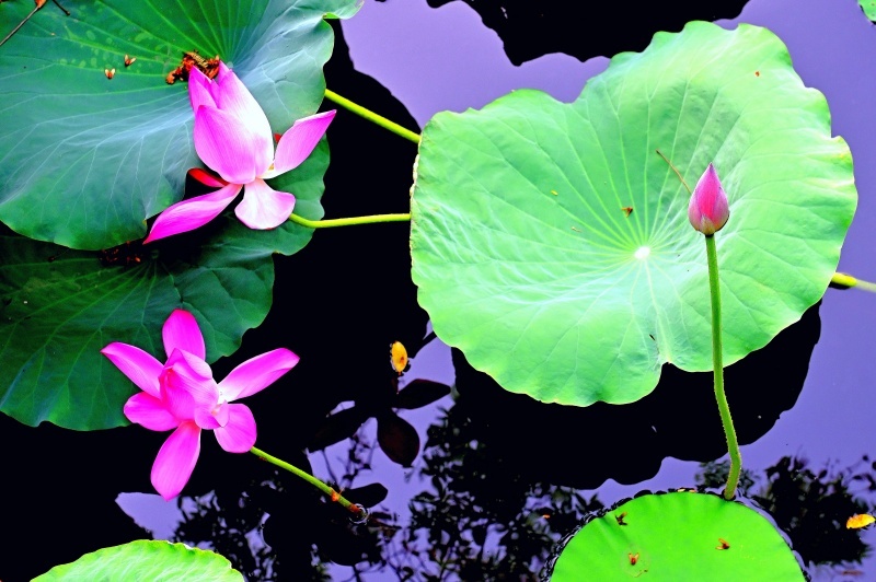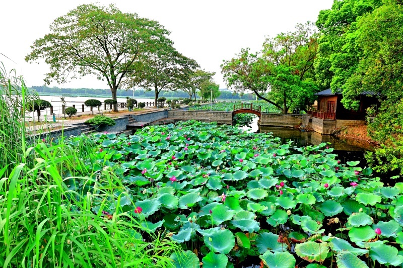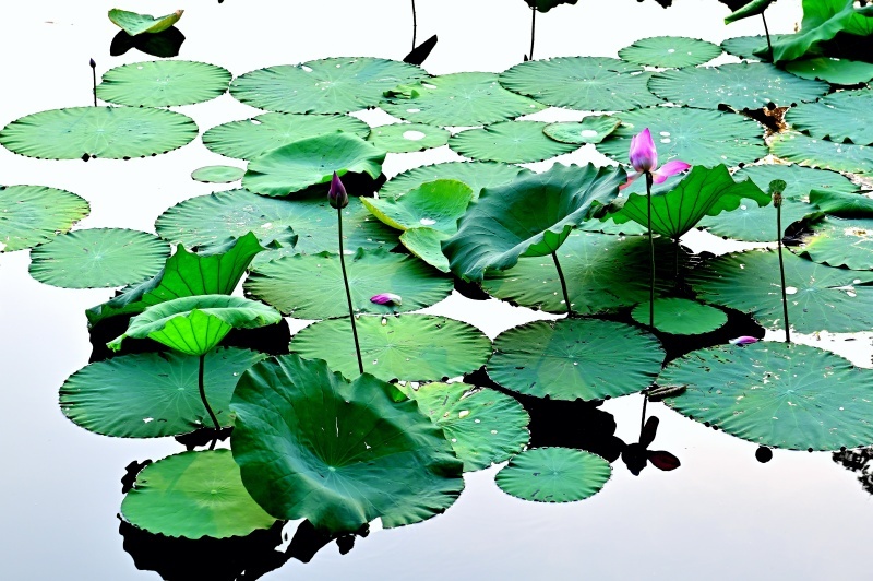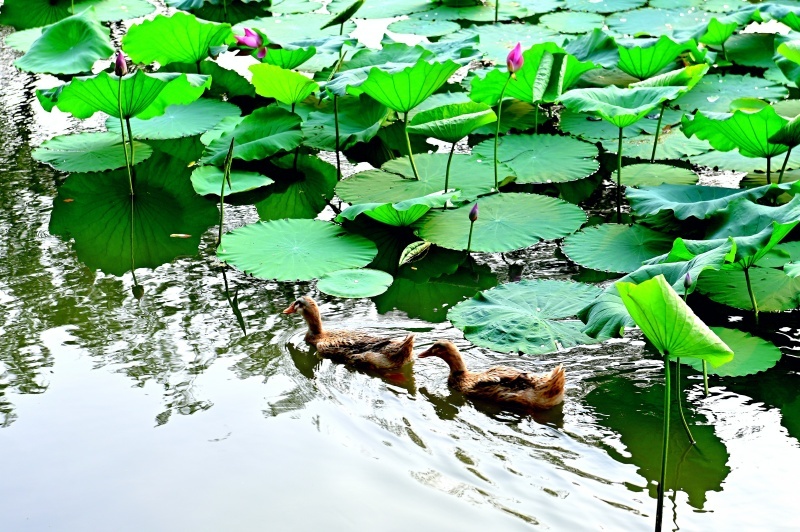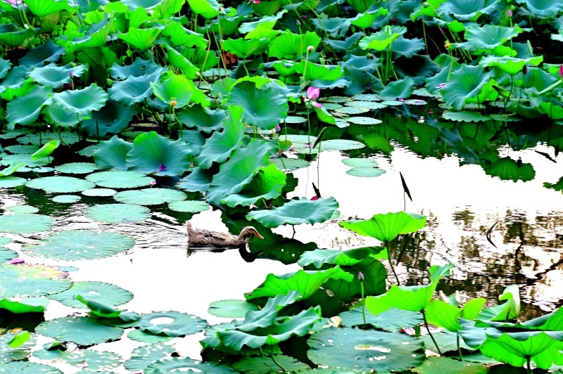 再看看荷叶,那绿伞般的荷叶密密层层的簇拥在一起,随风起舞,鱼儿不时地在荷叶间游弋觅食。由于湖畔林间,位置僻静,游人鲜少,显得异常恬静安宁,恍如隔世……