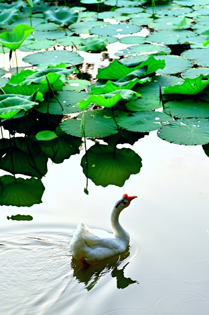 倒是养在池塘里的几只大白鹅和麻鸭,不时在水里游来晃去,觅食嬉闹,吱吱嘎嘎的声音, 给宁静的荷塘增加了几分生机。