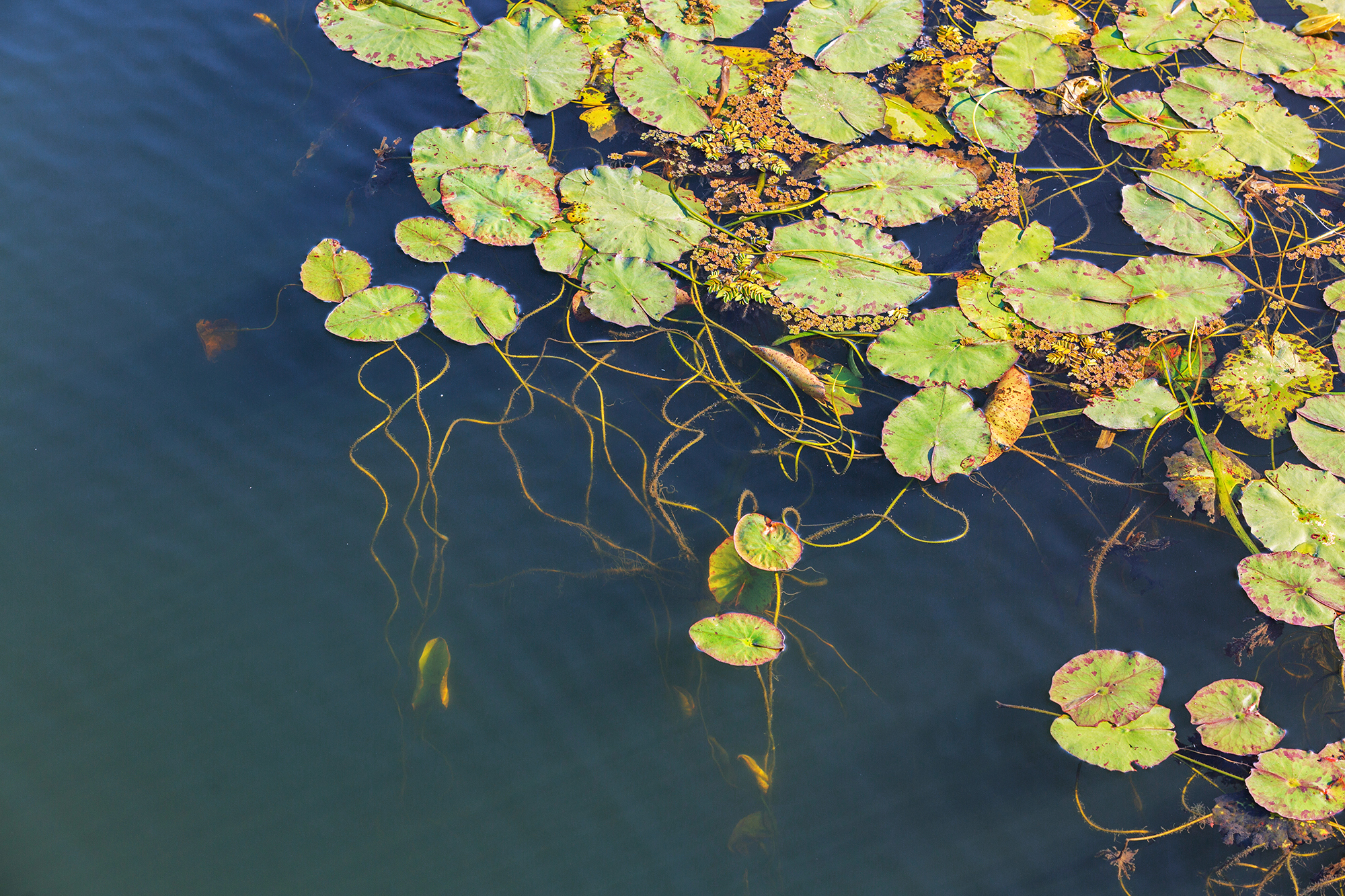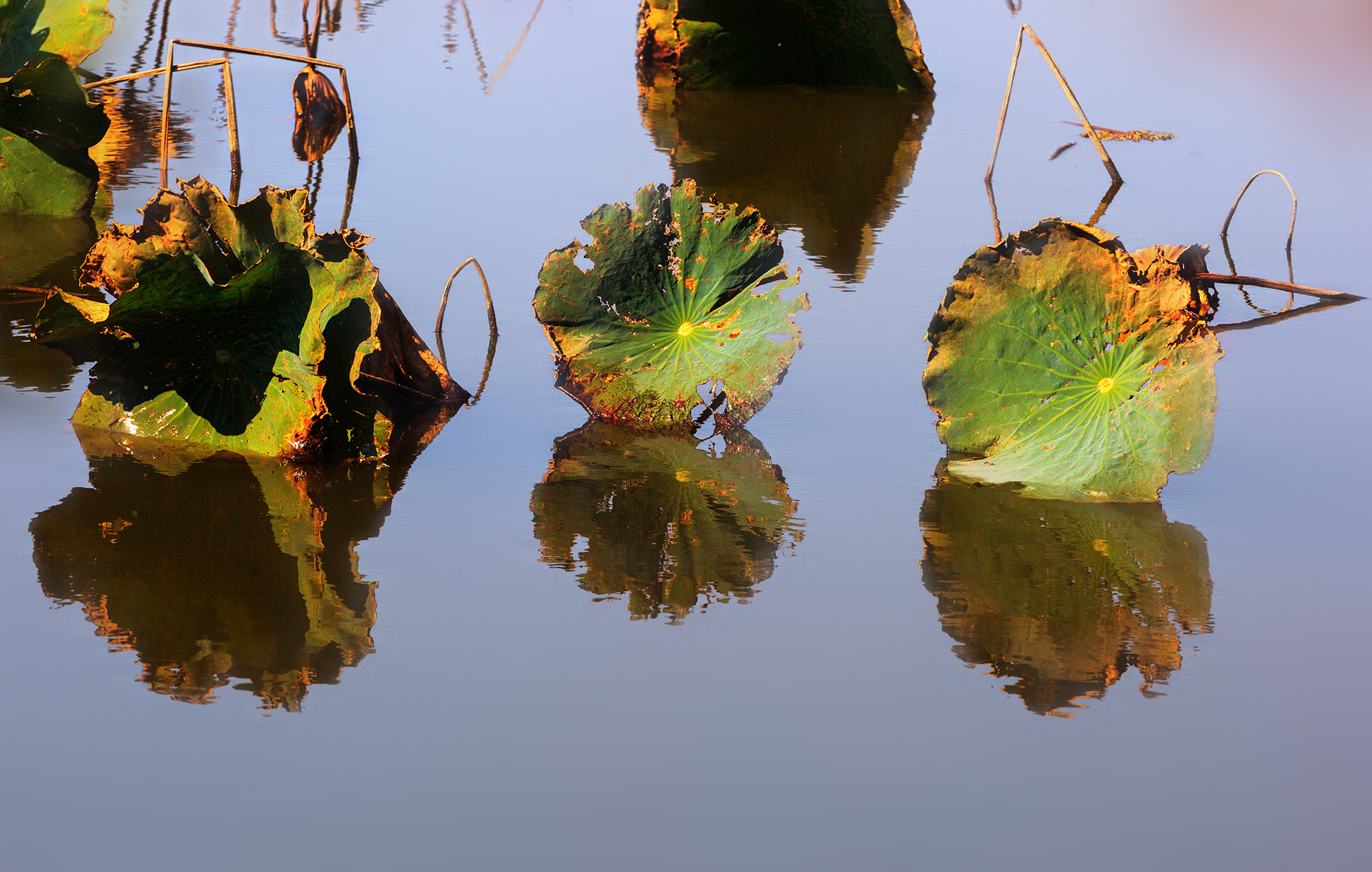 而你再看那斜卧水面的枯叶,倒立水中的梗干,似乎裹挟着摄人心魄的气度,满蓄着生命不息和悄然待发的禅意。